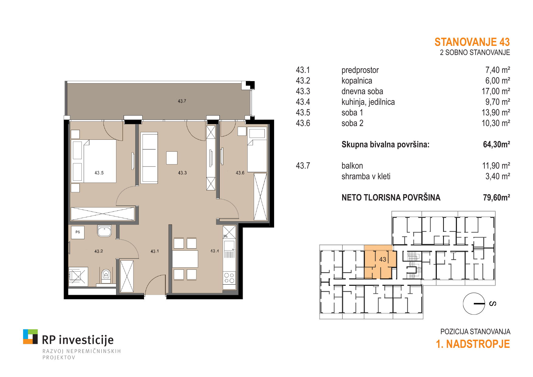 | Prodano | Stanovanje 43 | 2. nadstropje | 3-sobno | Klasično | 64.3 m2 | 11.9 m2 | 79.6 m2 | Prodano | Podrobnosti |